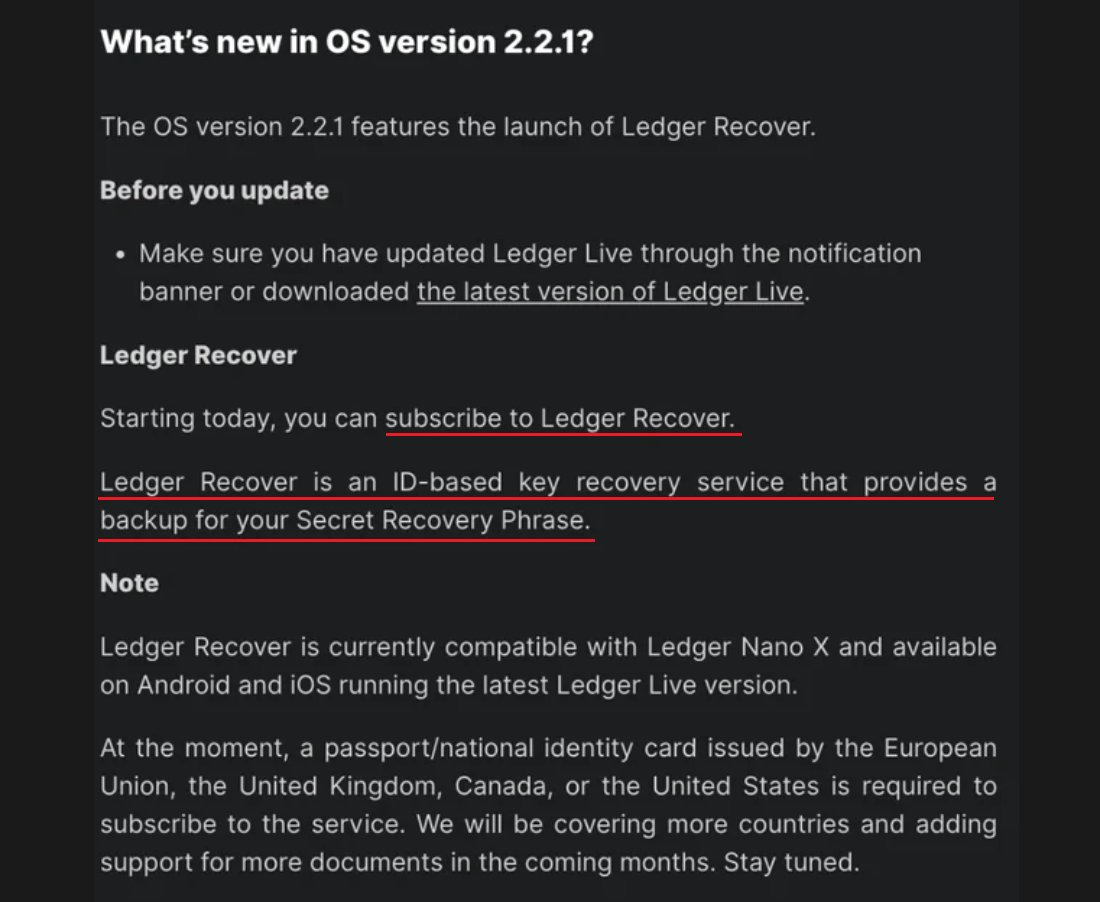 "Crypto" is filled with nefarious people, companies, and affiliates that like to enable God Mode. Ledger is the latest culprit. In their latest OS 2.2.1 update, 'Ledger Recover' allows trusted 3rd parties to gain access to your assets through an ID-based recovery service. I don't know who needs to hear this, but "trusted 3rd parties" ARE A SECURITY THREAT!
