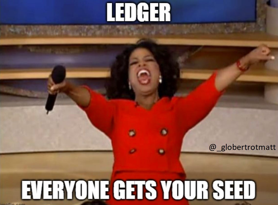 Ledger was a prominent hardware solution for many because they support many different cryptocurrencies. BITCOIN ONLY companies never have this problem because their ethos is VERIFY, DON'T TRUST. Ironically, every ledger nano comes with a small piece of paper that says, "Trust yourself."